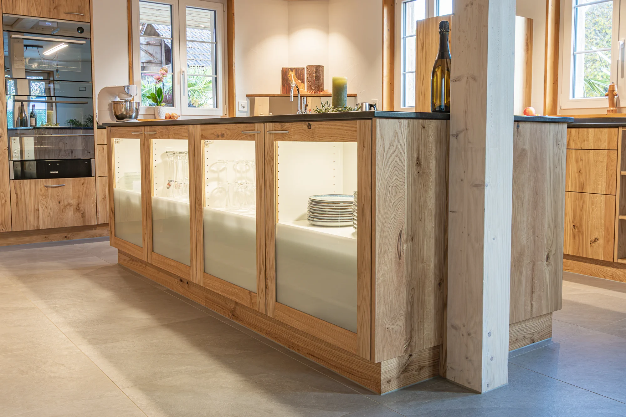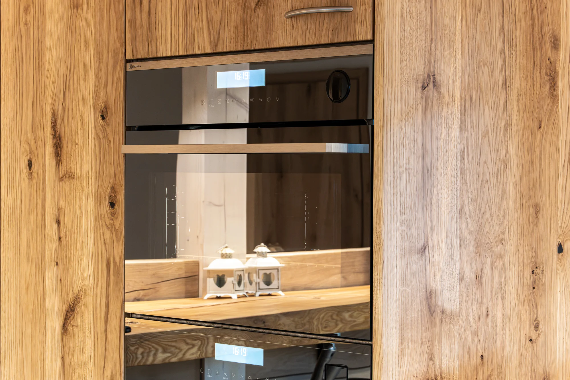 Diese besondere Küche verbindet hochwertige Materialien, naturverbundene Ästhetik und präzises Handwerk. Die Fronten bestehen aus dreischichtigem Eichenholz und zeigen ein lebendiges Astbild, das dem Raum Wärme und Charakter verleiht.